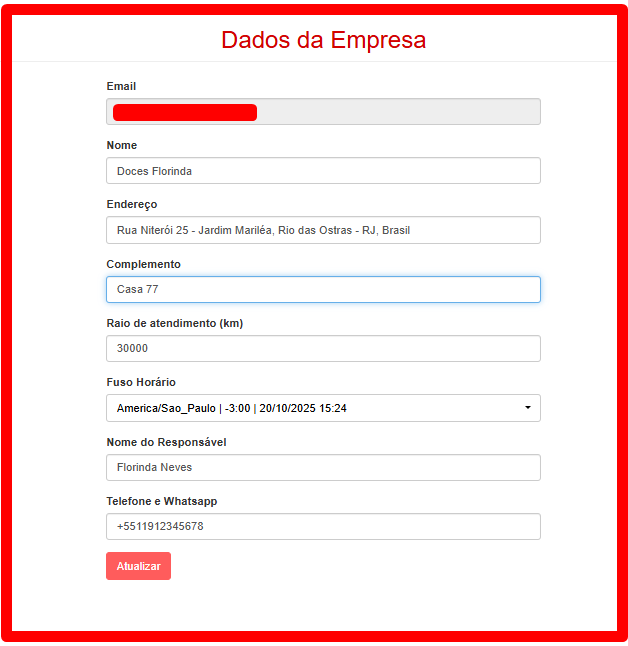Com exceção do campo Email, qualquer outro dado pode ser modificado a qualquer momento. Para atualizar o e-mail de acesso ao sistema, deve-se entrar em contato com a equipe de atendimento da Foody Delivery, via WhatsApp, pelo telefone (11) 96341-4808, de segunda a sexta feira, das 09:00 as 20:00 horas.
