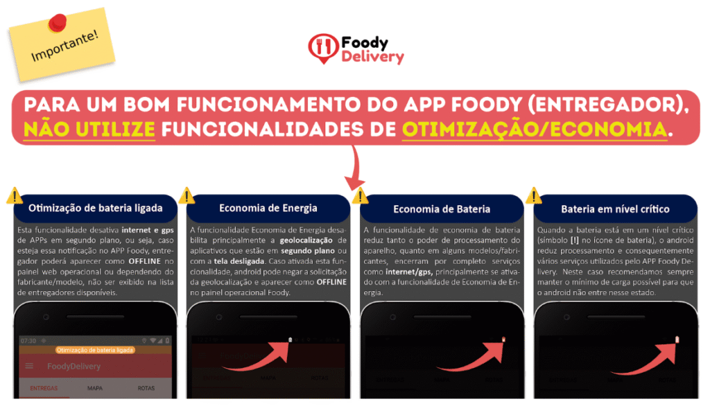📌Observação: APPs que ativam funcionalidades nativas do ANDROID (otimização/economia) podem interferir diretamente na operação, tanto do cliente direto Foody (Painel Operacional), quanto do entregador, que poderá não receber pedidos despachados caso seja negado solicitação de internet, gps ou processamento ao APP. Antivírus ou firewall (mobile) também podem atrapalhar o bom funcionamento do APP Foody.