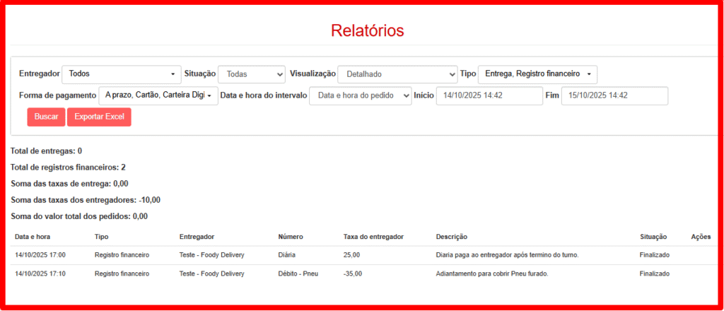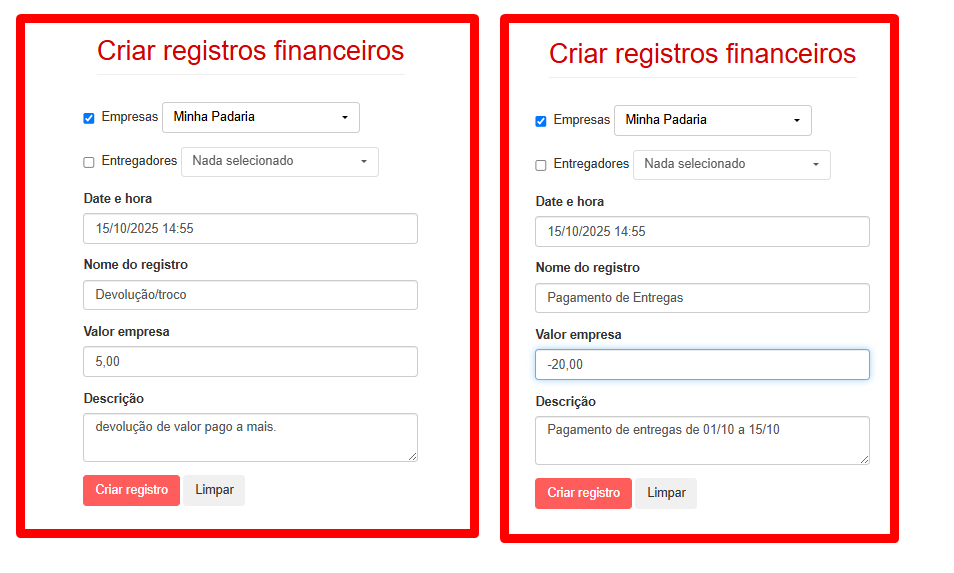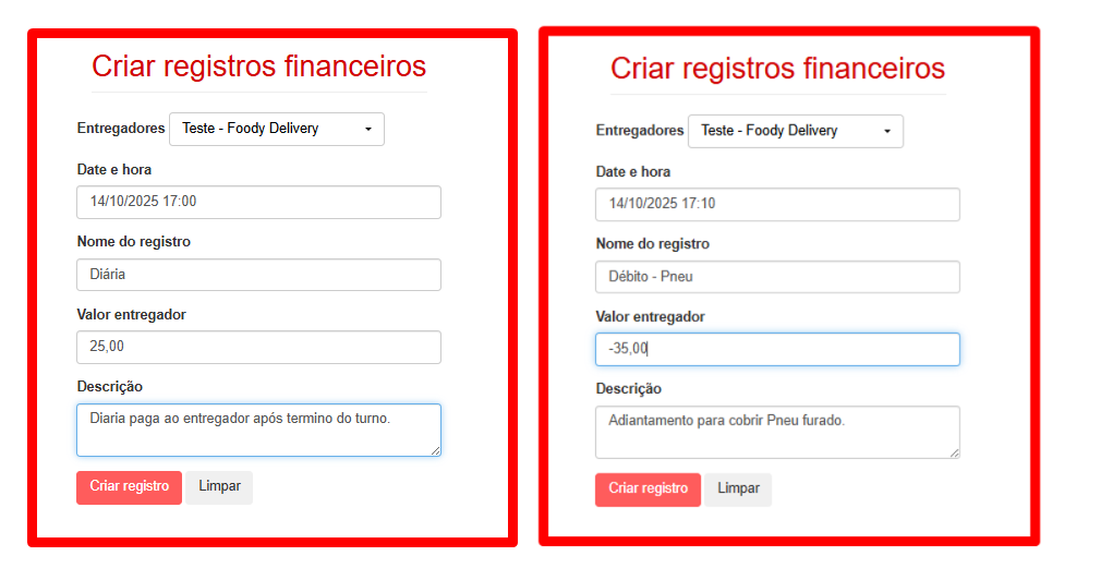 ATENÇÃO: Uma vez que seja criado um registro financeiro, seja para estabelecimentos Frota Própria, Central ou Empresa de Entregas, não será possível exclui-lo. Por isso, para valores inseridos incorretamente, é recomendado o lançamento de um segundo registro com o valor oposto (positivo ou negativo) para abater o valor inserido incorretamente.
