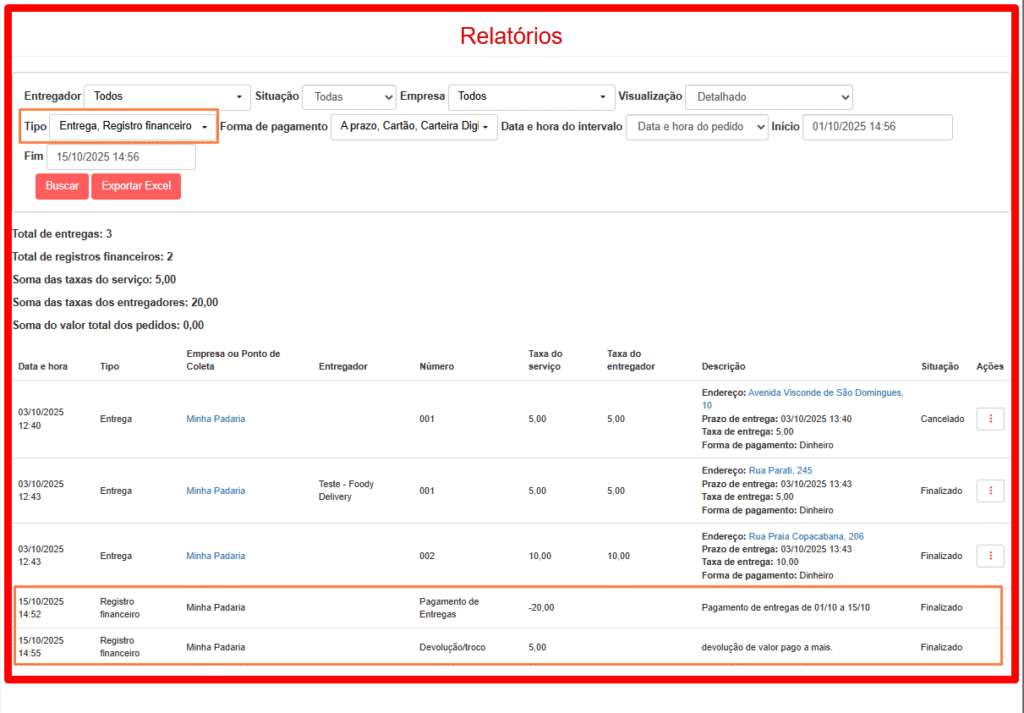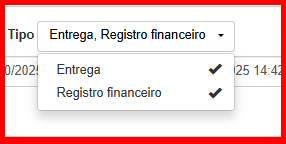 Observe que na página de Relatórios, há filtros que podem ser utilizados especificamente para pesquisar os registros financeiros que forem lançados na conta. O TIPO é o filtro que se seleciona para consultar apenas registros financeiros, apenas as entregas ou ambos.