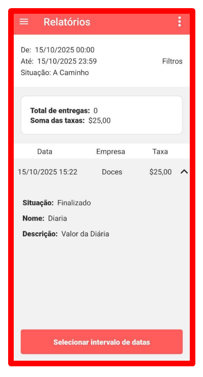 O entregador também consegue visualizar os registros que forem inseridos em seu nome, consultado na opção Relatórios, no seu aplicativo.