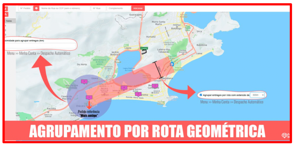 📌IMPORTANTE: A imagem é meramente ilustrativa, em seu sistema você não consegue visualizar os desenhos de circulos e retangulos que representam o Raio e a Extensão de Rota.