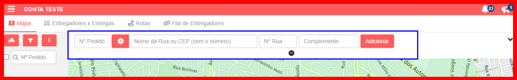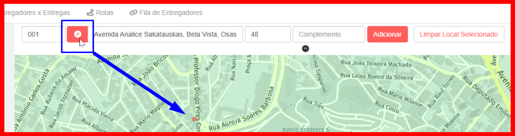 É importante verificar se a entrega foi adicionada no local correto, pois, em alguns casos, o sistema pode não ter identificado corretamente o endereço digitado. Sendo assim, antes de inserir o pedido, você pode usar o botão da Bússola, localizado ao lado esquerdo do campo endereço, para identificar onde a marcação será feita. O sistema irá indicar com um círculo vermelho onde será o registro do pedido ao clicar em Adicionar.