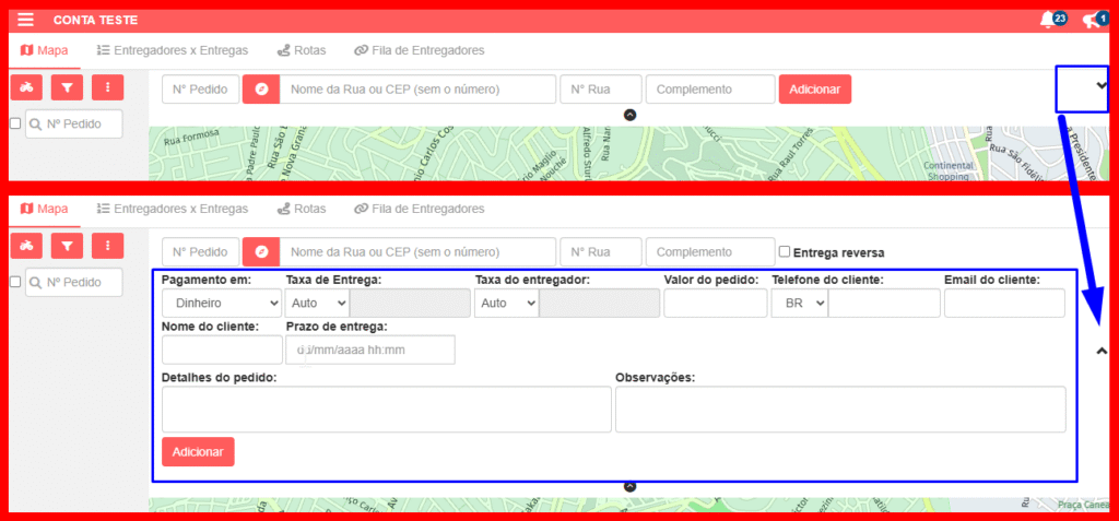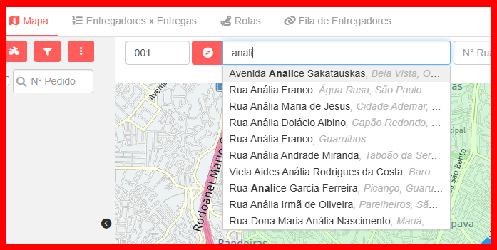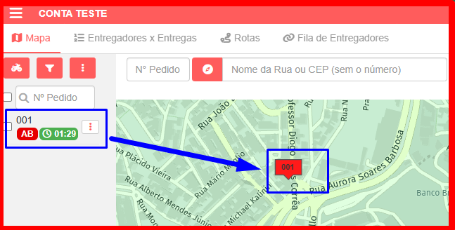 Quando a entrega for adicionada, um marcador constará no mapa, indicando o local da entrega, e ela será listada no campo esquerdo.