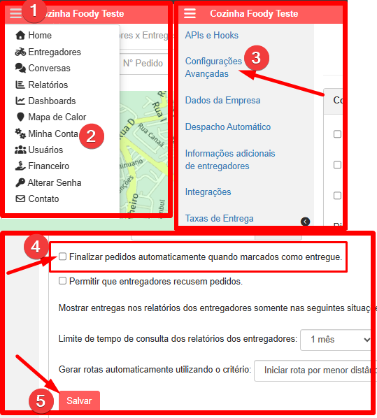 Podemos utilizar a opção de “finalizar pedidos automaticamente quando marcados como entregue” para que, quando um entregador marcar um pedido como Entregue, o pedido seja finalizado em seguida pelo sistema.