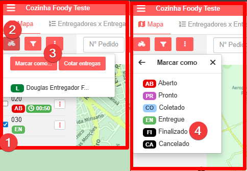 - Selecione um ou mais pedidos Entregues (verdes) no menu de pedidos do lado esquerdo da tela Home.