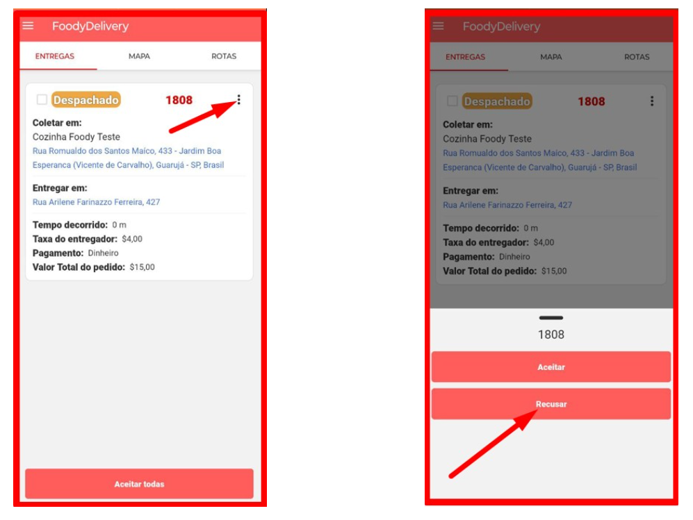Quando o pedido é Despachado para o entregador e ele o recebe no aplicativo, ao clicar no icone de Ações [ ⁝ ] (três pontinhos) aparecerá a opção de Recusar. O entregador só poderá recusar o pedido enquanto ele estiver no status Despachado (em laranja).
