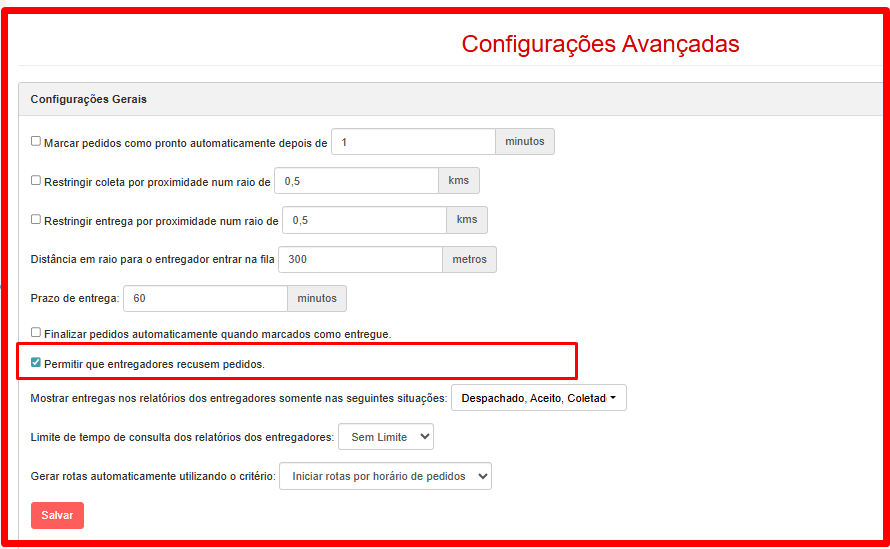 - Desmarque a opção “Permitir que entregadores recusem pedidos“.
