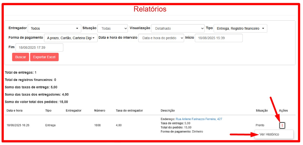 Para verificar se o pedido foi recusado pelo entregador, o estabelecimento consulta pelo histórico do pedido, através dos Relatórios. Para efetuar esta consulta, acesse o histórico do pedido seguindo o passo a passo a seguir: