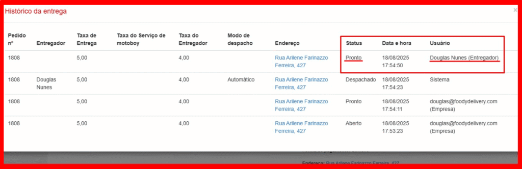 Na tela do histórico do pedido escolhido é possível visualizar as informações do ciclo desse pedido como por exemplo o horário que ele foi despachado, se foi um despacho manual ou automático, ou qual usuário que realizou tal ação.