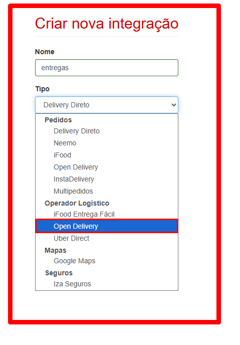 - De um nome e escolha na seção Operador logístico a opção Open Delivery;