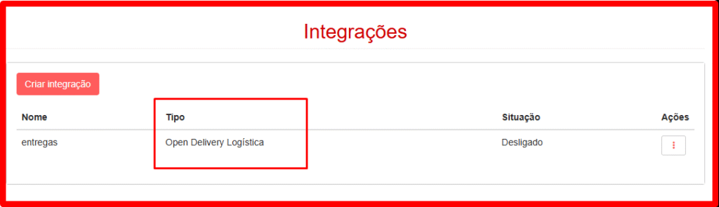 O sistema atualizará e retornará a página de Integrações, sendo possível visualizar a nova integração criada com o tipo Open Delivery Logística.