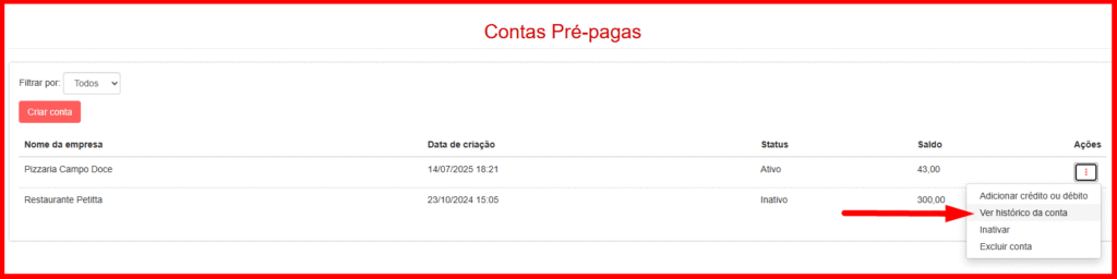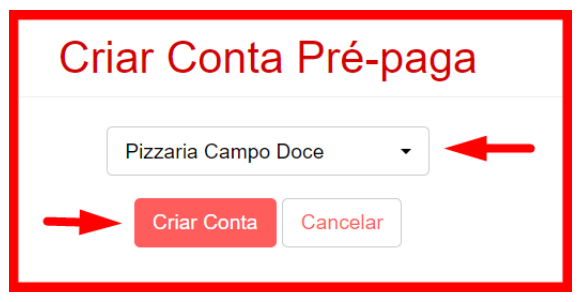 Selecione o estabelecimento e clique em Criar Conta, assim apartir desse momento o estabelecimento já esta atuando no modo de conta Pré-Paga.