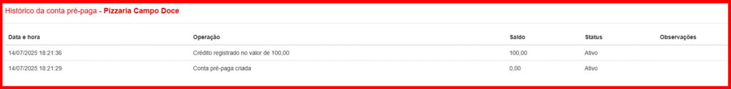 Você sera movido para Pagina Principal de Contas Pré-Pagas e o estabelecimento já vai aparecer em uma lista de de Contas para ser incluso.