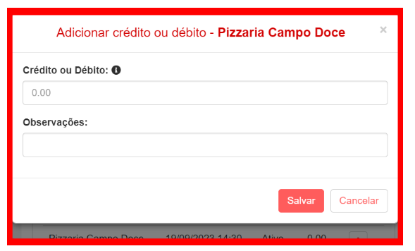 Ao fazer essa ação, sera carregado um Pop-up onde você pode colocar o Valor que deseja adicionar ou retirar do estabelecimento, junto de um campo de observação.