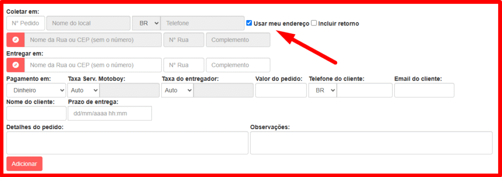 Clicando neste ícone, será exibido as opções de preenchimento dos dados de coleta e entrega. Por padrão, a caixa de seleção do item “Usar meu endereço” aparece selecionada, por isso, desmarque a opção para que seja possível inserir outros dados para a coleta.