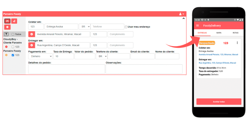 Pronto, basta clicar em Adicionar e o pedido será adicionado em seu mapa operacional Foody. O entregador que for atribuído para o pedido, saberá exatamente o endereço de coleta e o de entrega para então iniciar a logística da operação.