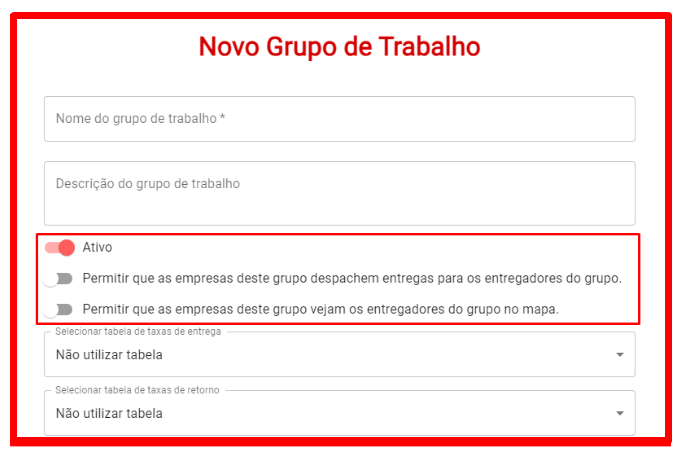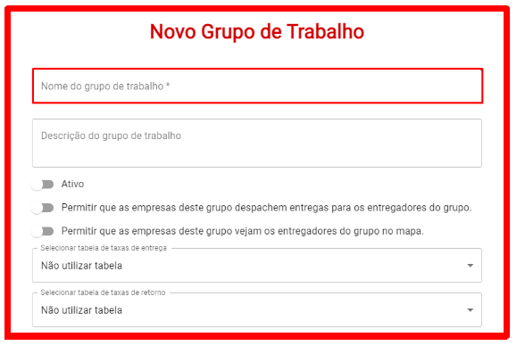 O Grupo de trabalho serve para estabelecer um ou mais motoboys para trabalharem fixos nas empresas selecionadas neste grupo, podendo configurar uma forma de despacho automático específico ou mesmo uma tabela de taxas para o grupo.
