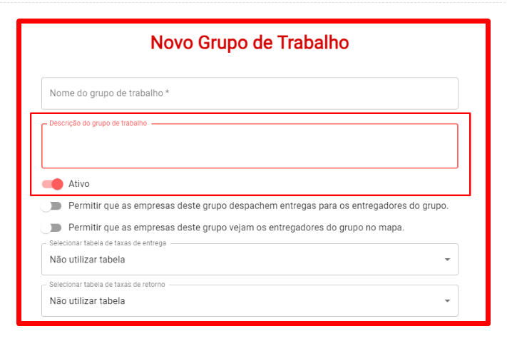 2) No campo Descrição, pode-se criar uma descrição para este grupo; Apesar de não ser obrigatório, pode ajudar na identificação caso a Empresa de Entregas crie mais de um grupo de trabalho.