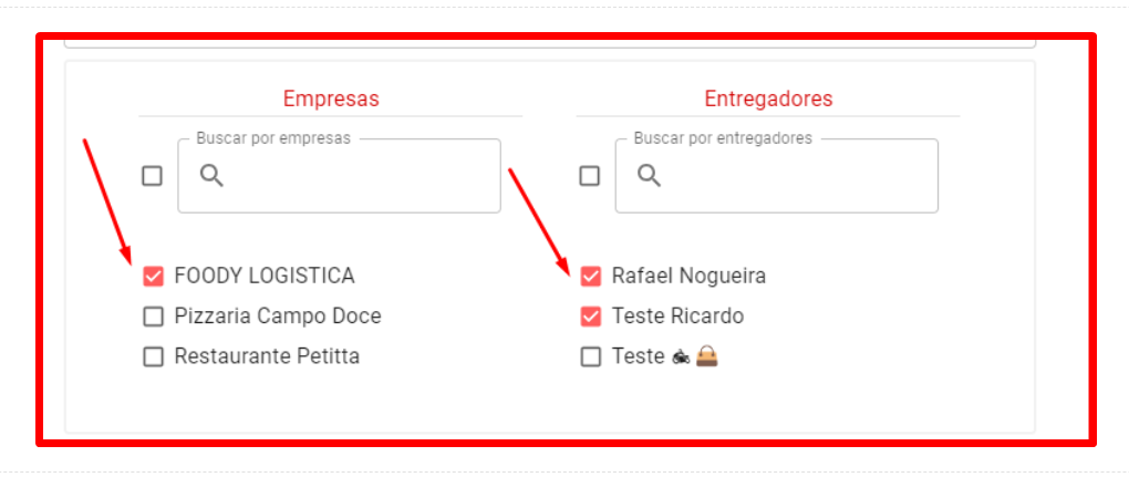 Para selecionar uma ou mais empresas, basta clicar na caixinha ao lado do nome da empresa, e o mesmo processo serve para os entregadores.