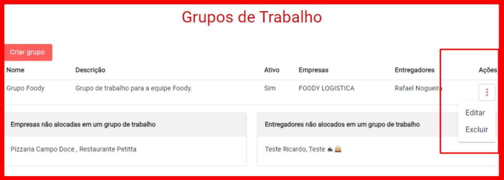 Após um Grupo de trabalho Criado, podemos Editar ou Excluir o grupo clicando no botão de Ação (Três pontinhos).