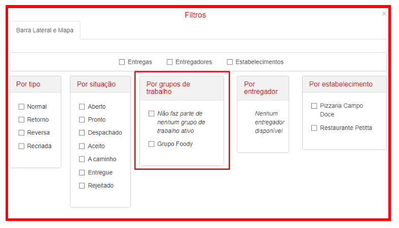 Ao criar um grupo de trabalho, na opção dos Filtros no mapa as empresas poderão aplicar filtros por Grupo de trabalho. Quando um grupo for excluido, ele também deixar de aparecer nas opções dos Filtros.